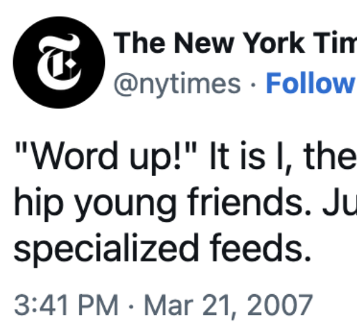 “It was very important to me when I was writing that tweet that even though the metaphorical Gray Lady would try to use slang, it was still very proper grammar,” he said. “‘It is I’ versus ‘It’s me.’ It’s like the Queen trying to use slang. It had to be that combination of fusty and fashionable.”