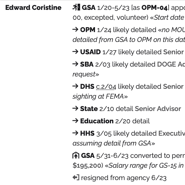 Clearly, there are things that could be done to improve how the data is presented. I might potentially create more simplified representations of important details like what systems DOGE has accessed and who was given access or how OPM and GSA were used as bases for DOGE staff to be detailed into multiple agencies. I could probably consider generating better graphics using Observable or even write dispatches on new things that have been uncovered (for instance, I have figured out who most of the unidentified staff at Social Security are or reminding people that DOGE already had infiltrated the email systems at CISA well before a whistleblower at the NLRB had emailed them about DOGE’s IT modernization activities there). But I also am not a journalist. I am making my best efforts to be correct, but mistakes are possible. So, I will probably just keep to perfecting the data, in the hopes that it’s useful to others.